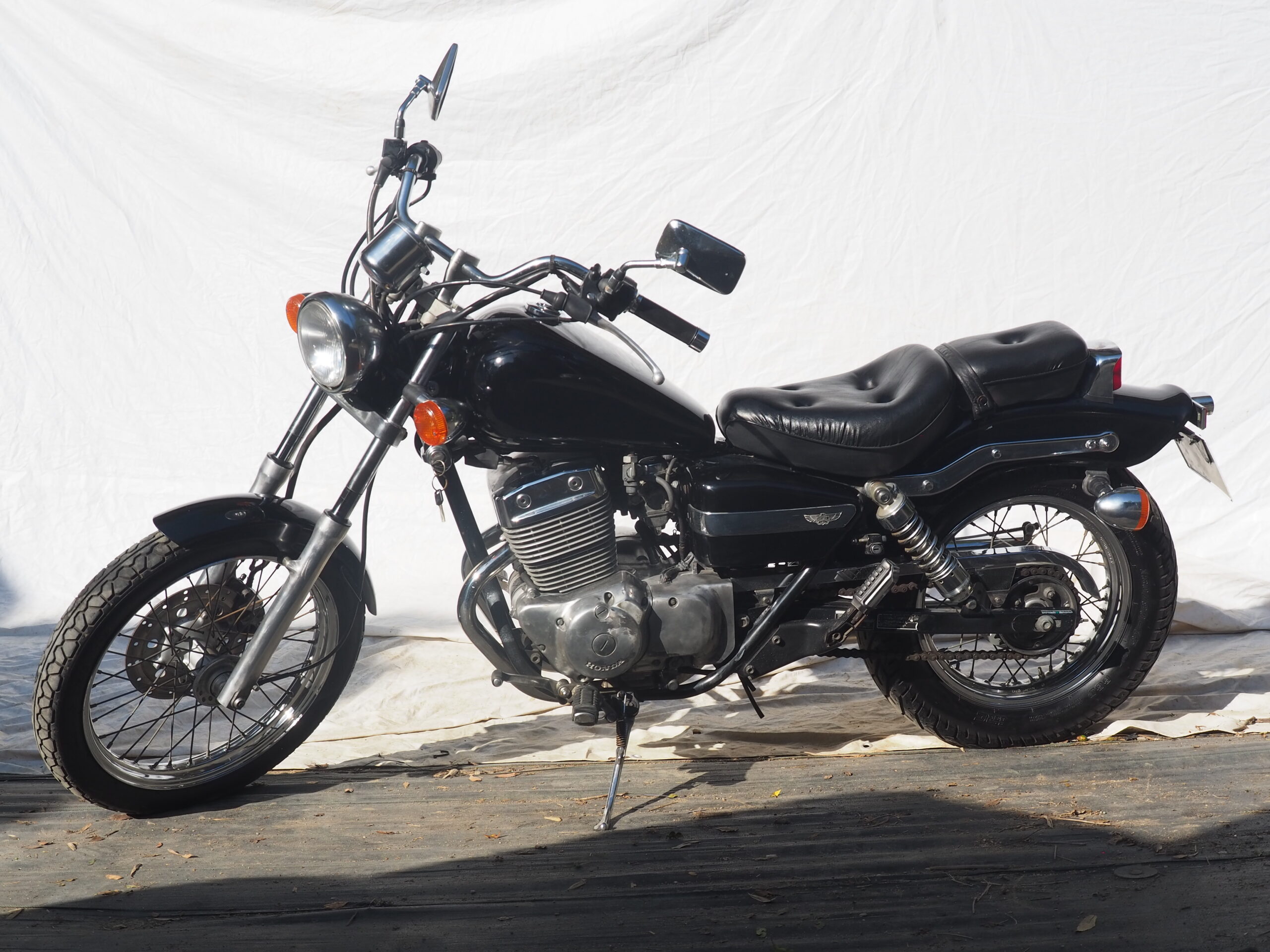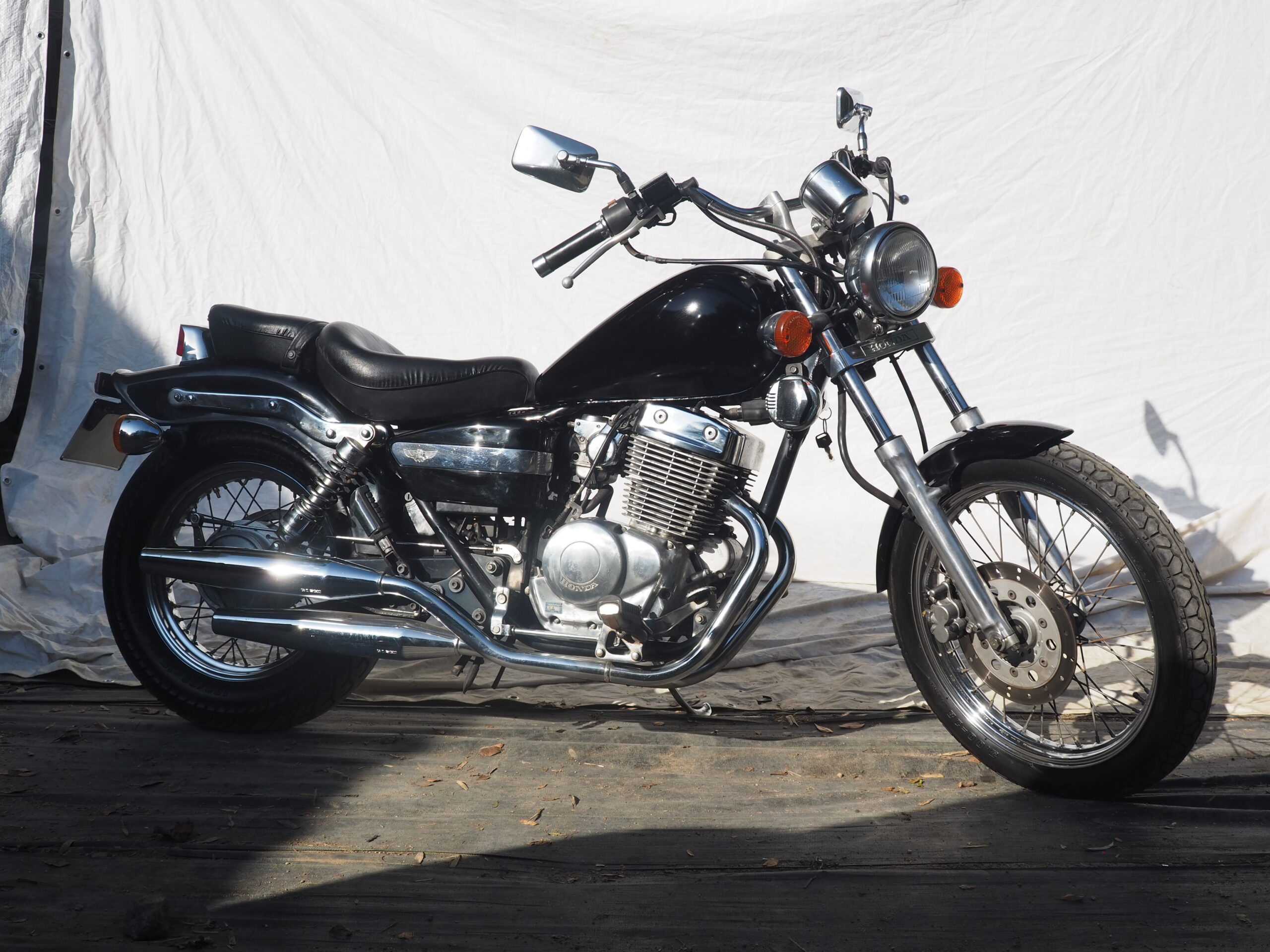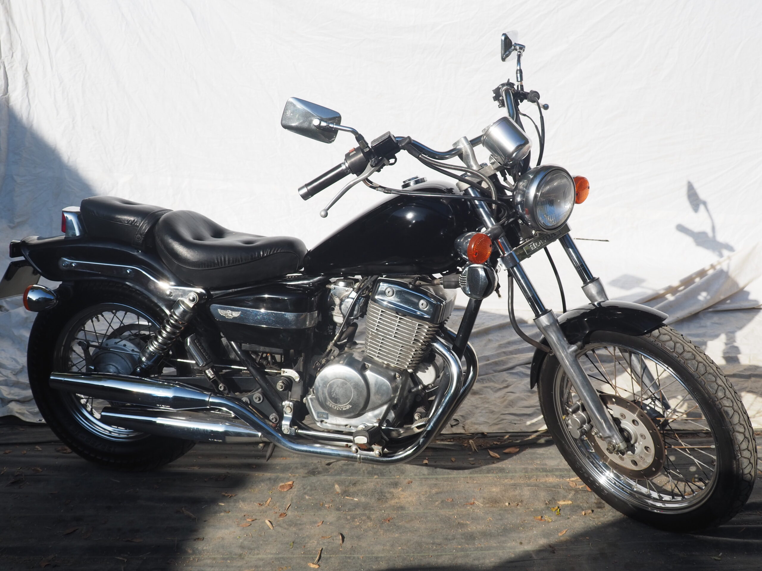 250㏄現行レブルの前モデル、現行レブルより30㎏程軽量であるためか、カタログスペックよりパワフルで乗りやすい車両です。車重が軽く重心が低いため、取り回しもしやすく、一番の特徴は2気筒空冷エンジンで、純正マフラーながらでも単気筒では出せないサウンドで250㏄ながら納得のマフラーサウンドです。